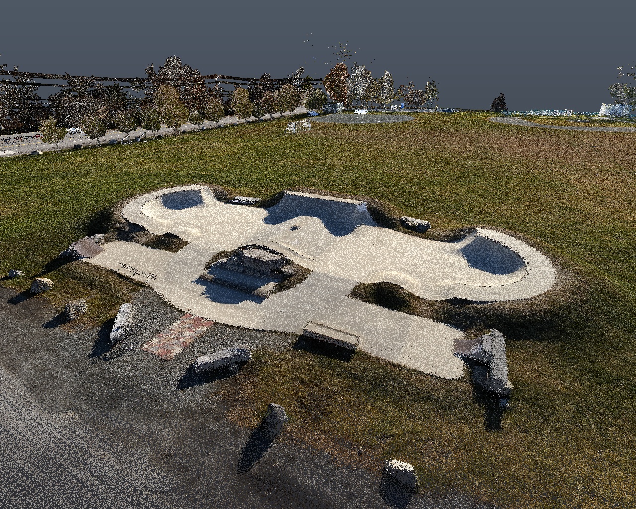 Close Range handheld LiDAR point cloud of picnic tables in pine grove Harbor Park, Northeast Harbor, Nov. 2023